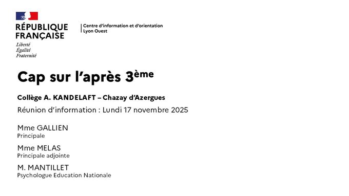 Par GAEL MANTILLET, publié le lundi 6 novembre 2023 16:30 - Mis à jour le lundi 17 novembre 2025 16:47Accéder à la présentation power point au format pdf de la réunion d'information relative à l'orientation post 3ème à destination des représentants légaux du 17 novembre 2025.